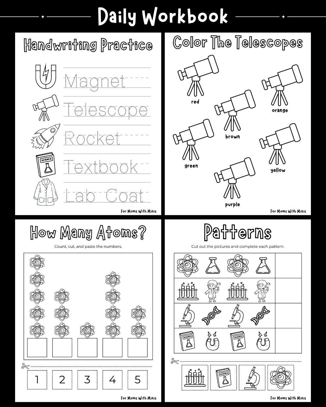 This science-themed daily workbook is filled with hands-on, engaging activities that help kids practice important early learning skills. With a fun mix of handwriting, counting, coloring, and pattern-building, every page brings something new and exciting. The science visuals—from telescopes and rockets to atoms and test tubes—make each activity feel fresh and playful. Whether your child is working on letter formation or sharpening their number sense, this workbook supports learning in a way that feels more like fun than work. It's perfect for preschoolers and kindergartners who are curious and love a little adventure in their learning time. Whether it’s for home, homeschool, or the classroom, this workbook is a great screen-free option that keeps kids focused and having fun.
