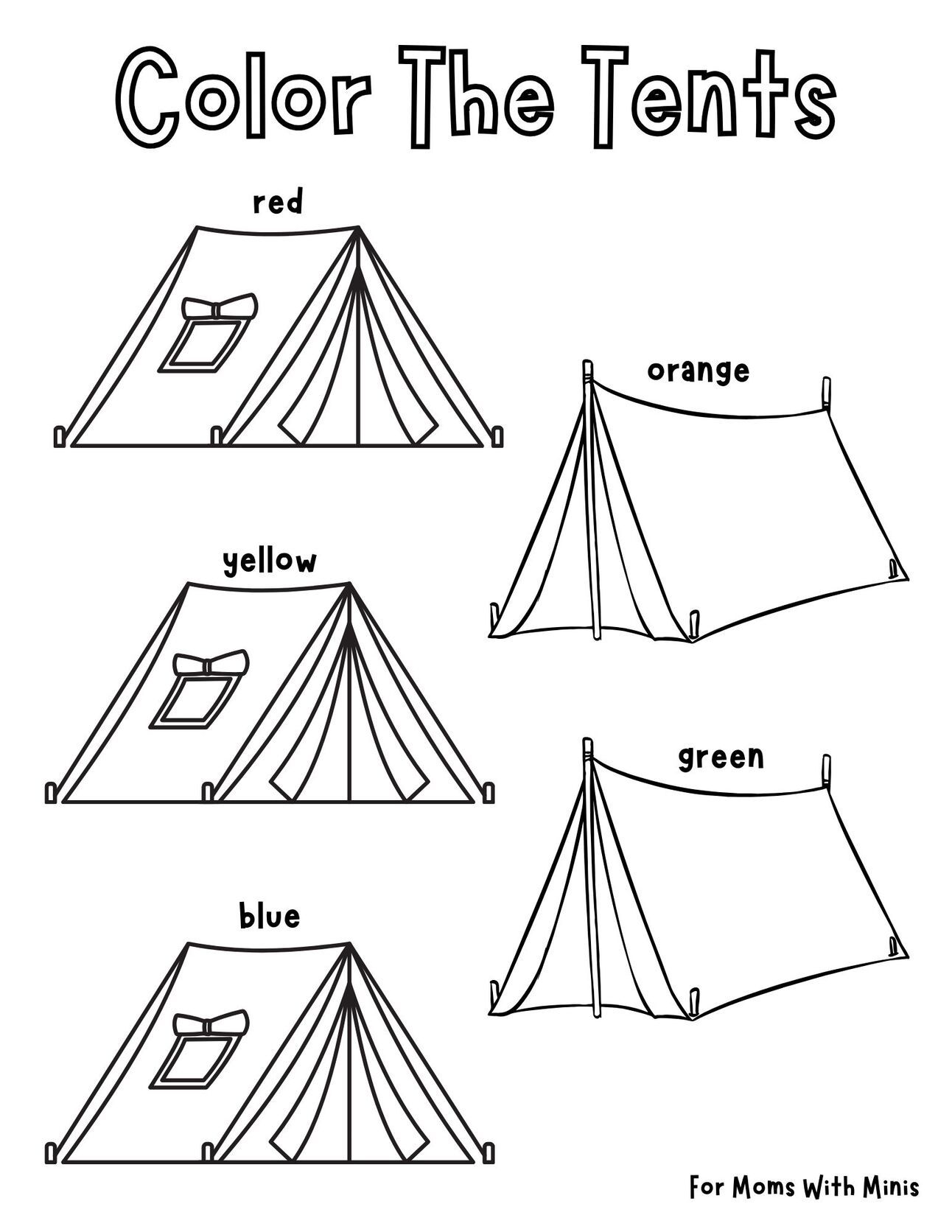 This page lets kids bring camping tents to life with colors! Each tent is labeled with a different color, like red, yellow, or blue, for kids to color accordingly. It’s a creative way to reinforce color recognition and get them excited about outdoor adventures.