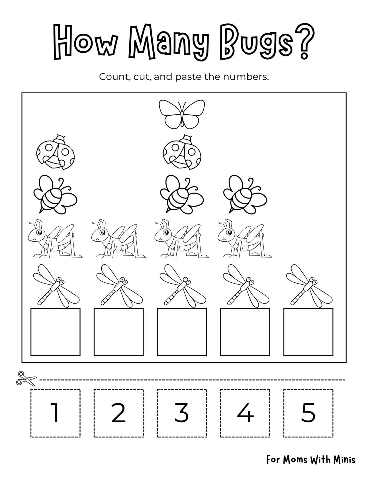 This hands-on counting activity asks kids to count the bugs, cut out the correct numbers, and paste them in the boxes. It’s an interactive way to practice number recognition, fine motor skills, and counting all at once. The cute bug illustrations make it even more enjoyable!