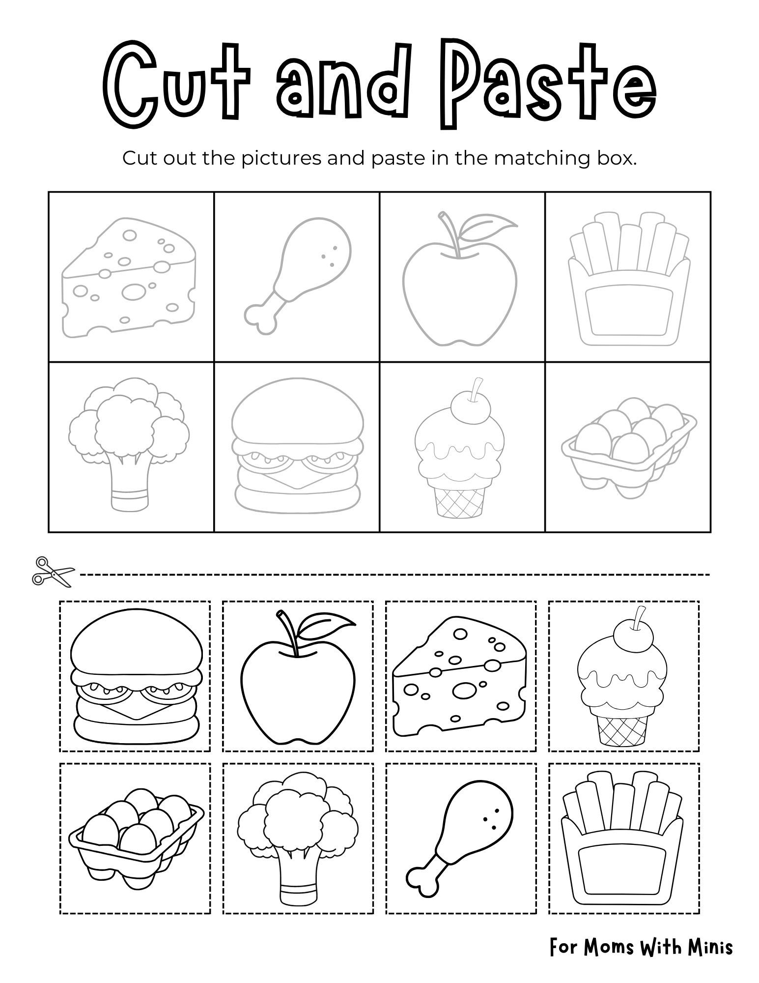 Cut and paste activities are a preschool classroom staple — and this Food Cut and Paste printable is a fantastic example of why! This hands-on worksheet challenges children to cut out food pictures and paste them into the correct matching spots, building fine motor skills and visual discrimination at the same time.