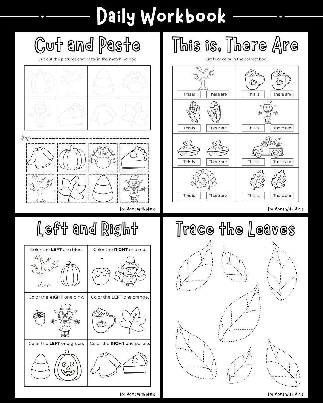 This daily workbook is filled with fun, fall-inspired activities that help preschoolers and kindergarteners practice early learning skills. From cut-and-paste puzzles to grammar basics and tracing exercises, every page supports both creativity and skill-building. The autumn theme keeps things playful with pumpkins, pies, turkeys, and more. Kids will work on fine motor skills, left and right recognition, early grammar, and visual matching—all while having fun. It’s perfect for home practice, classroom enrichment, or seasonal learning units. This workbook brings a little fall magic into everyday learning in a way that feels cozy and fun!