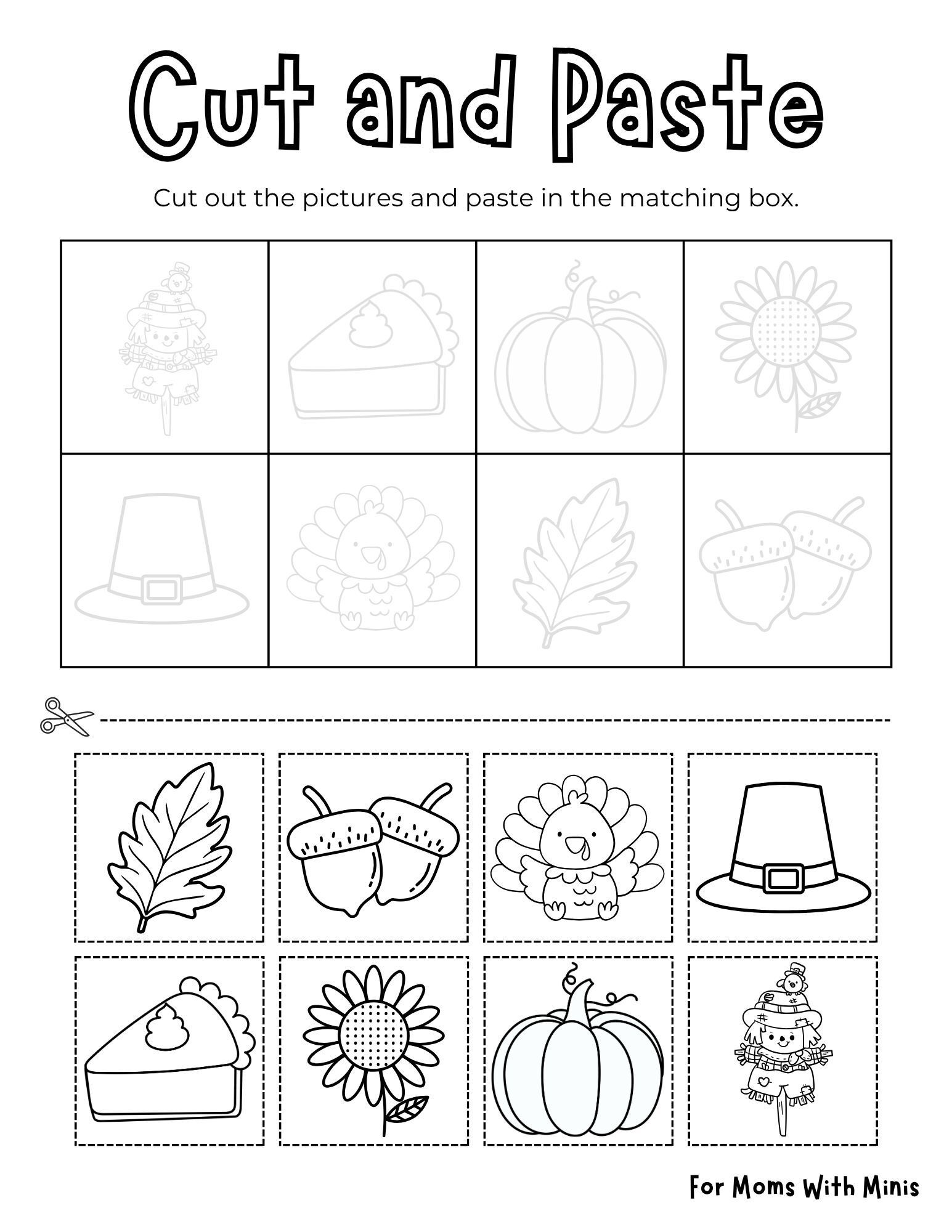 The “Cut and Paste” worksheet is a hands-on favorite that strengthens fine motor skills and scissor practice. Kids cut out the Thanksgiving-themed pictures, then paste them into the matching boxes. It’s a great way to combine learning, creativity, and coordination!