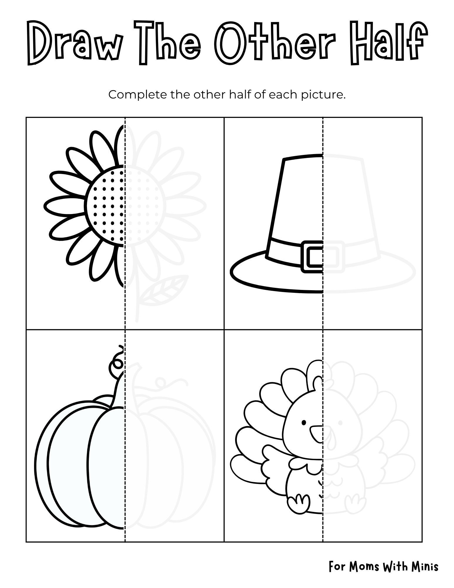 This “Draw the Other Half” activity encourages fine motor control and symmetry awareness. Children complete each picture by drawing the missing half of Thanksgiving-themed items like a pumpkin, hat, and sunflower. It’s a wonderful way to practice observation skills, attention to detail, and artistic confidence.