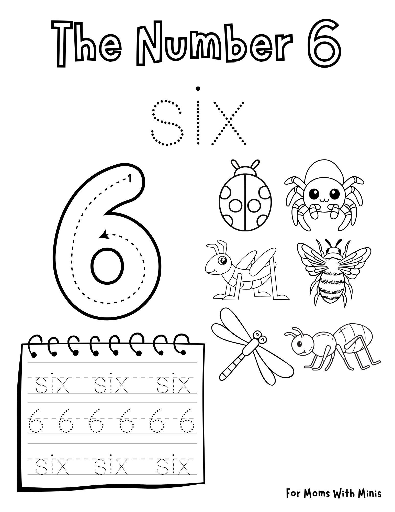 Learning numbers is more exciting with bugs! On this page, children trace the word “six,” the numeral 6, and practice writing it themselves. There’s also a counting activity where kids count six different bugs. This worksheet blends handwriting, number recognition, and counting all in one. It’s the perfect hands-on way to reinforce early math skills.