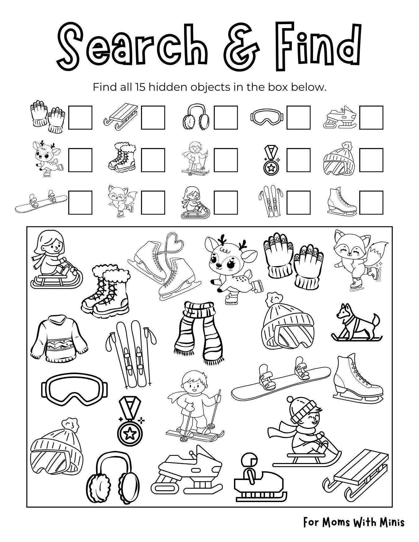 This Winter Sports Search & Find worksheet gives little learners a fun way to practice their visual scanning skills. Children look closely at the page to spot different winter items—like skates, snow goggles, boots, and ski gear—and check them off as they find them. These types of activities help strengthen attention to detail, observation, and early critical thinking.